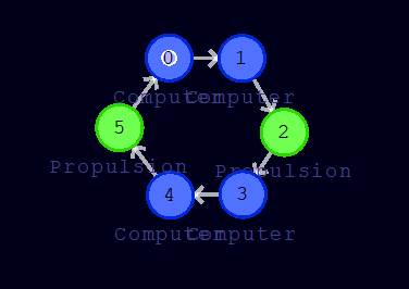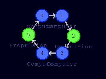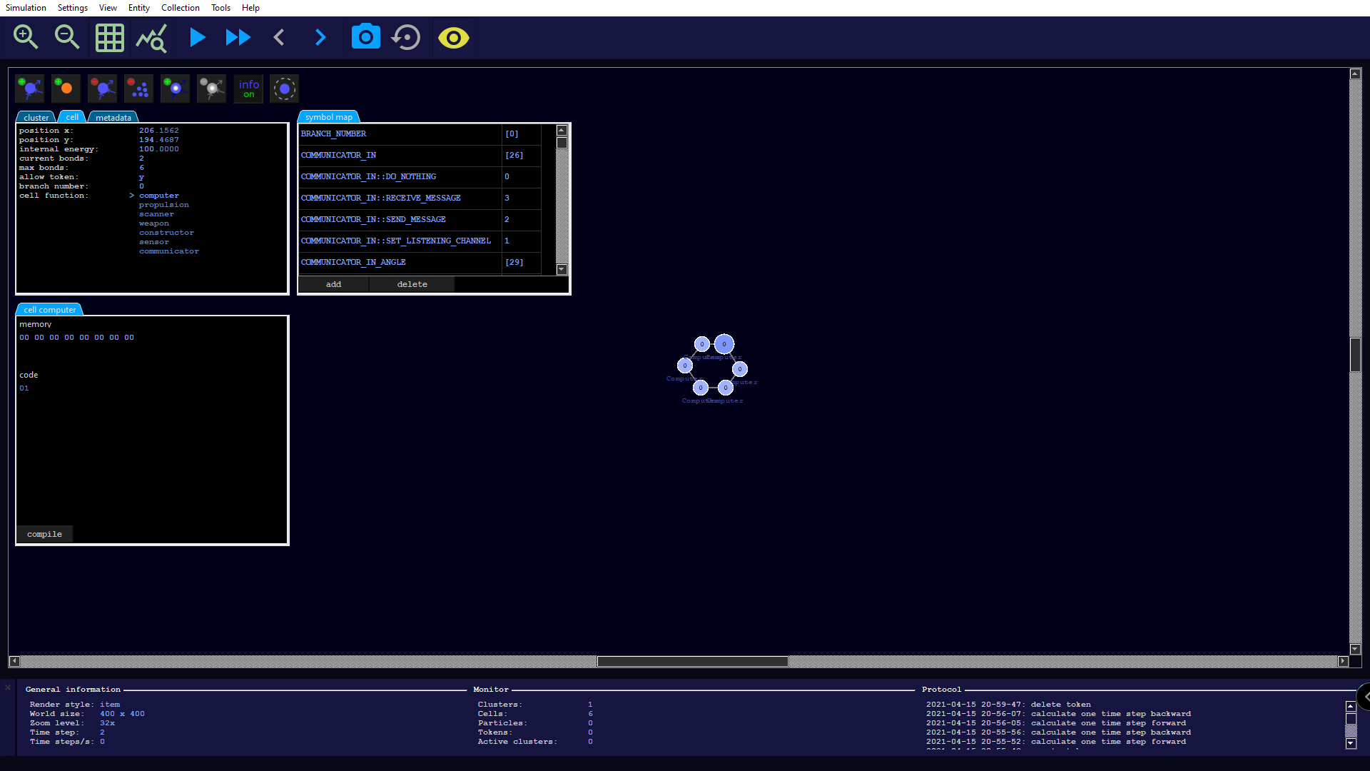 Our previous design would not be able to do anything yet. What is missing is to set the appropriate control commands for the propulsion cells. In general, as soon as a token passes a cell, the token memory is used to extract the control commands for the cell functions. Hence, we need to set the appropriate control commands in the token memory via a little program in the computer cell functions. The computer cell functions are programmed with a kind of machine language, which are compiled from an assembler-like language.
