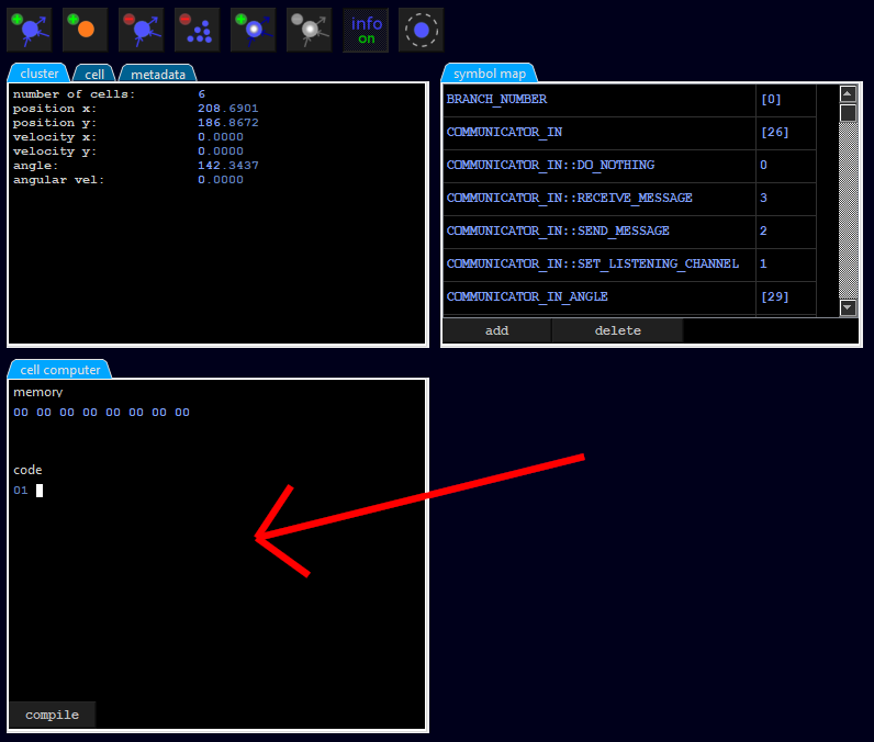 One more remark: We see that a memory content is displayed above the source code. This is not the memory of the token (the token is currently placed on cell 0), but the memory of the cell. By default the token memory is 256 bytes and the cell memory is 8 bytes large.