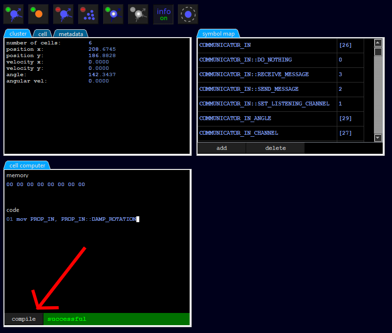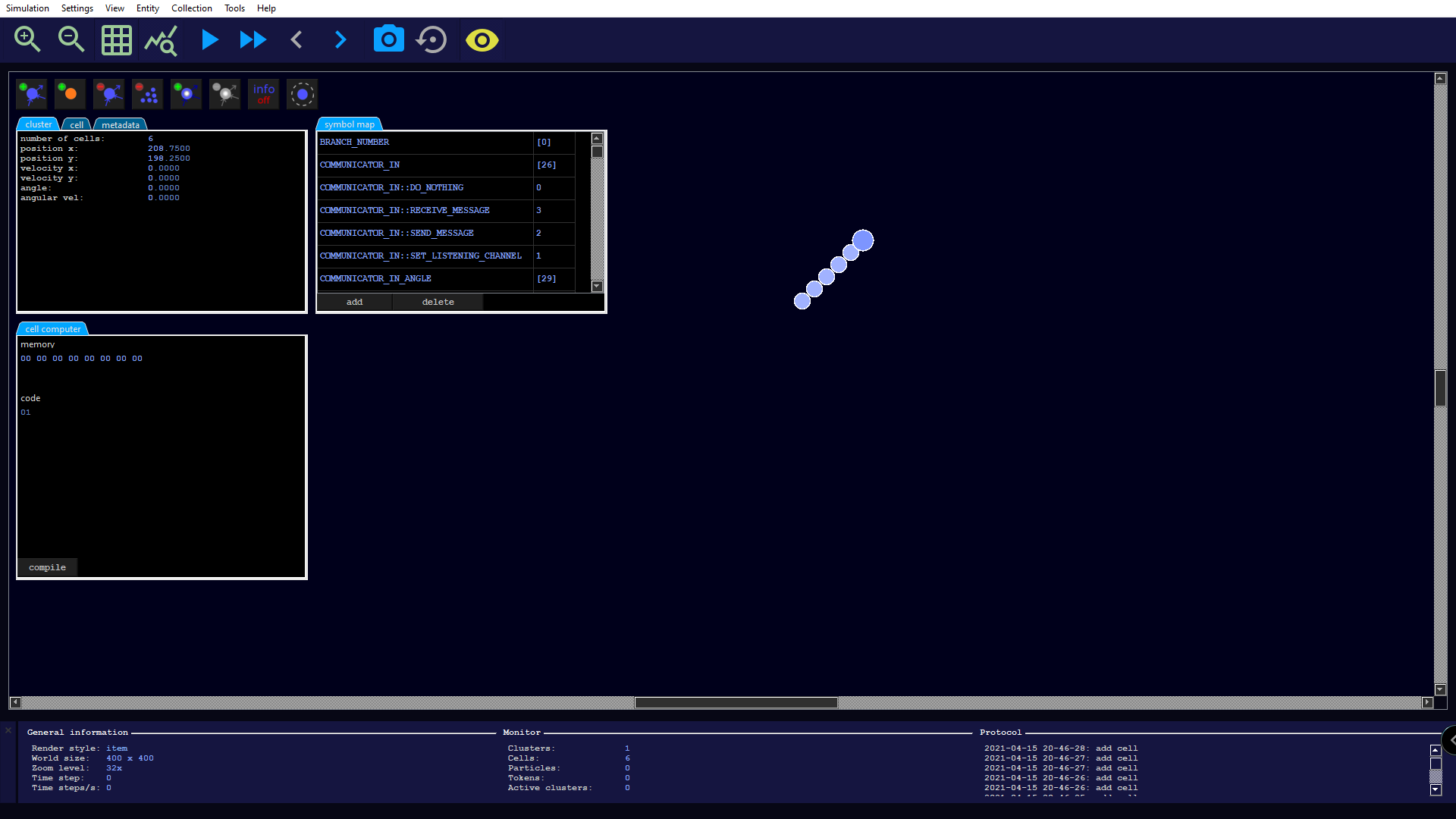 As a first task, we will reprogram the cell with branch number 1 to write a command in the token memory that will cause the propulsion cell to dampen the angular velocity. The program on this cell will be executed when the token is one time step away from a propulsion cell.