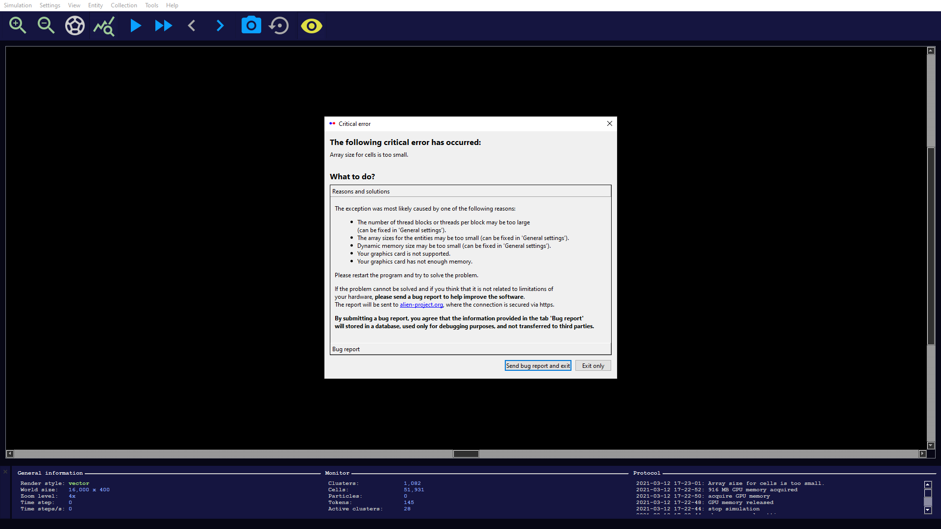 The error dialog gives possible hints to the cause ("array size for cells is too small") and allows sending a bug report to alien-project.org if the user wishes to do so. The most common causes of crashes are too high thread block count or too small array sizes for the entities. If you cannot solve the problem, it would be very nice of you if you could send a bug report.