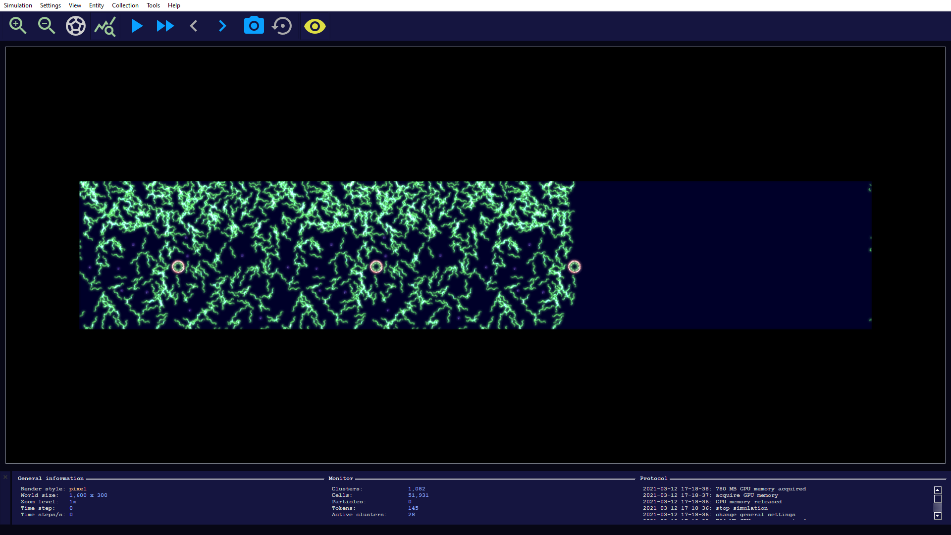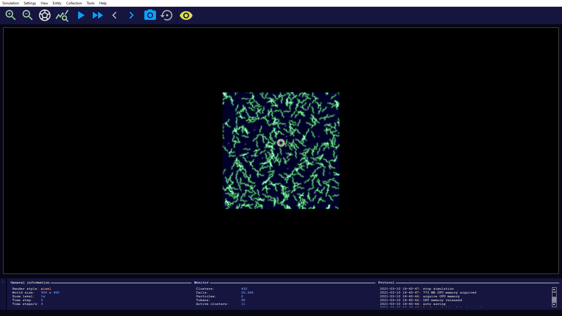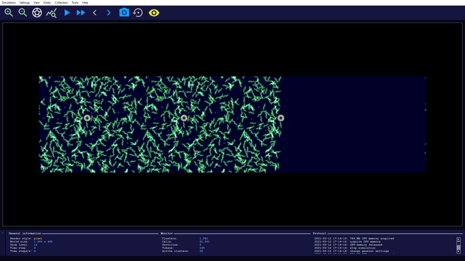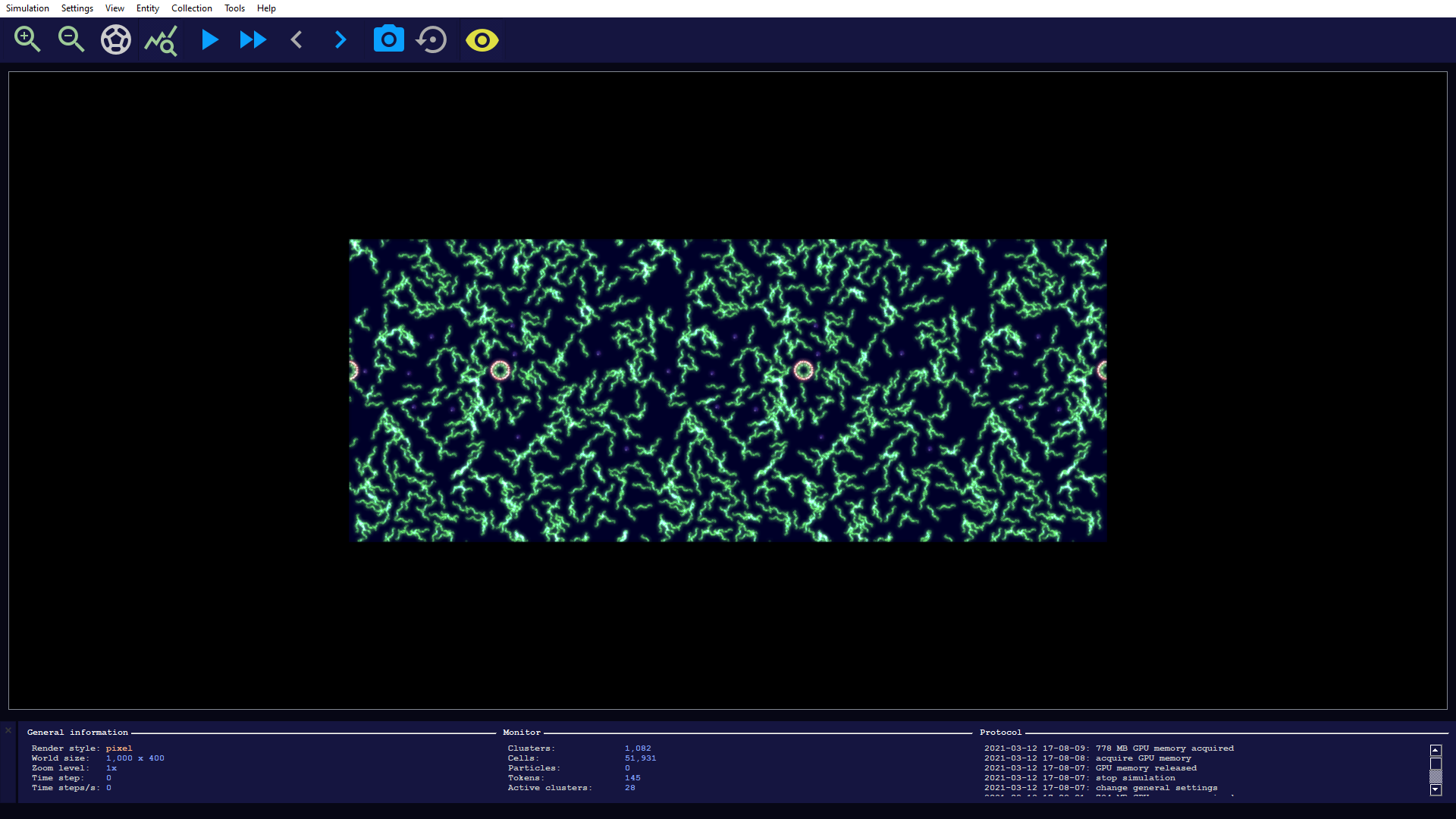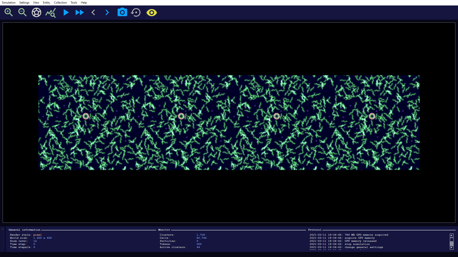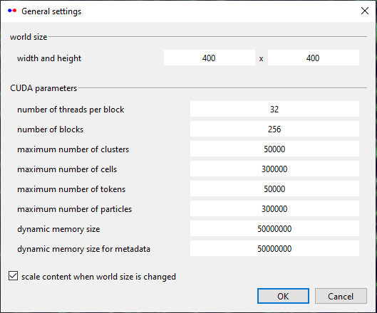 - maximum entities/dynamic memory: The entire simulation code is written in CUDA and operates on predefined memory blocks. Currently there is no automatism that calculates and dynamically adjusts the sizes. Therefore, you need to specify the maximum number of cells, clusters, particles and tokens in advance. In addition, memory is required for dynamic processes (to perform the cell functions) and for storing metadata (e.g. colors, names, descriptions and program code of cells). If you upscale a world a lot, you may also need to adjust these values accordingly.